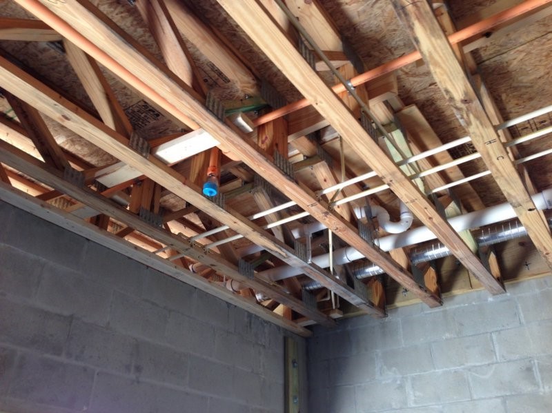 Garage Inside Wall looking up showing Lower Level Bath Vent pipe, sewer pipe, water & pink sprinkler pipes & Master Bath Shower trap.